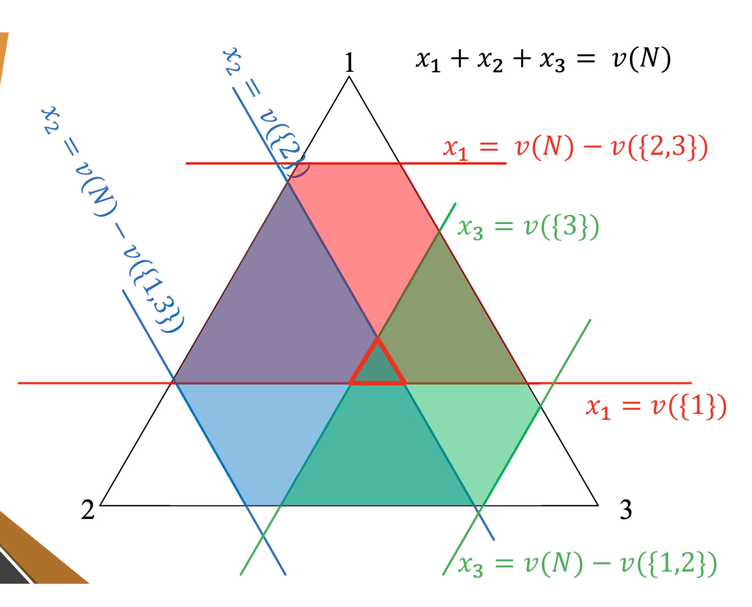 For a 3-player game, we can find the core by drawing a triangle, and then each point on the triangle maps to a payoff vector. e.g. the top vertex means that all the payoff goes to the first player. The midpoint of the bottom edge means that the payoff vector is $$\vec x = (0, \frac{v(N)}{2}, \frac{v(N)}{2})$$. In general, each person gets paid in the inverse of the ratio of the distance from the point to the edge opposite that player’s vertex.